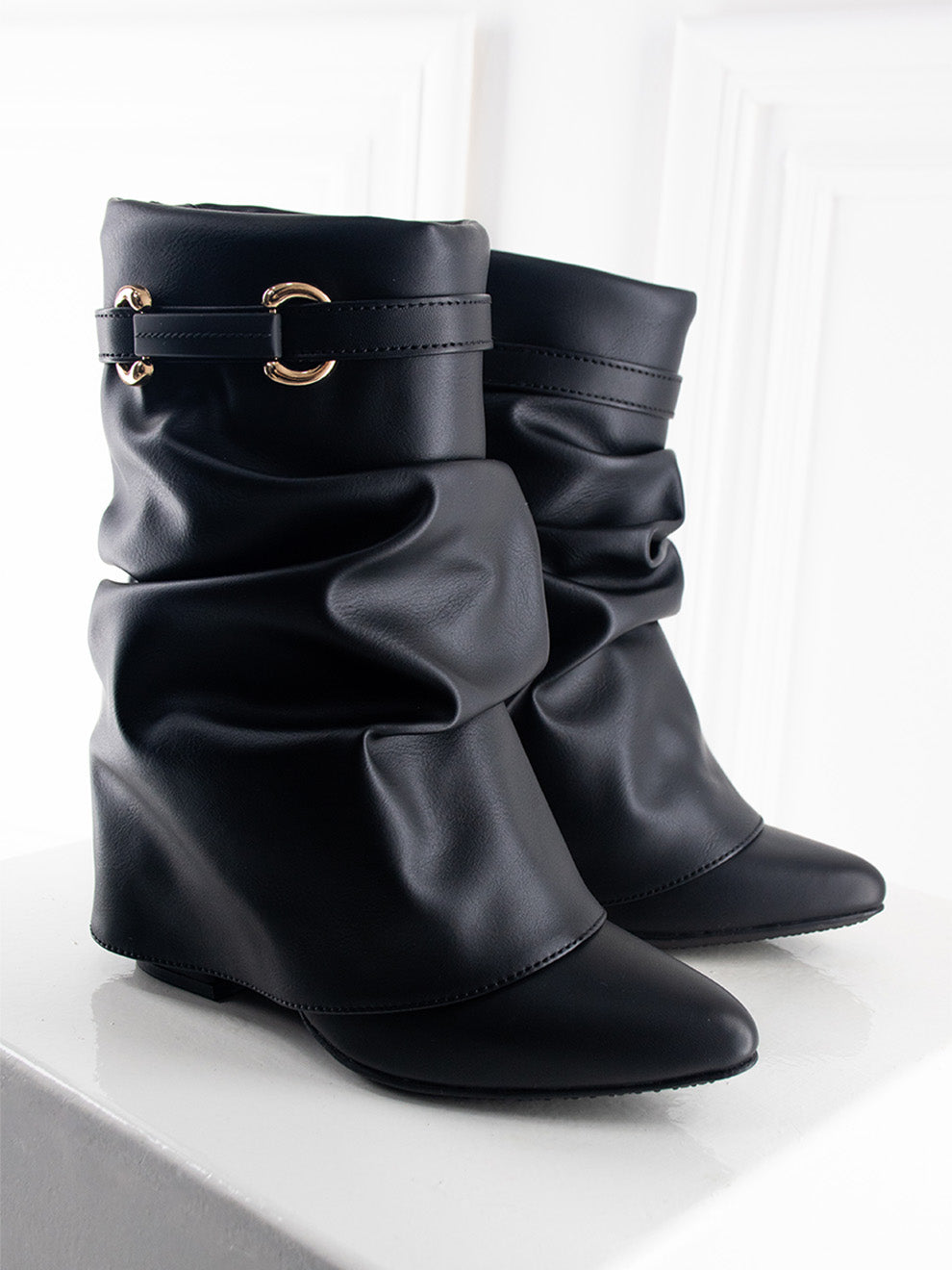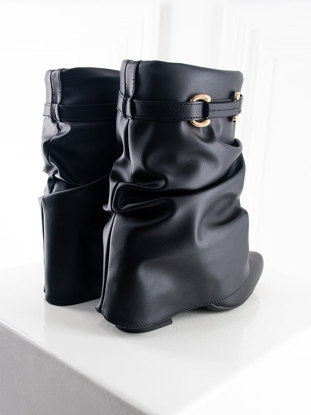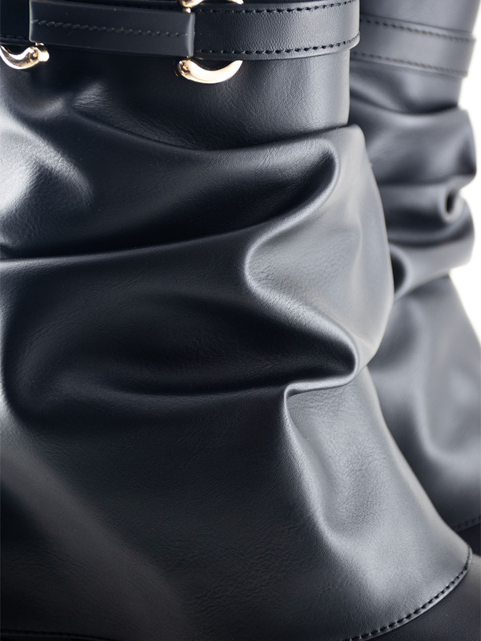 Iris combina una caña media tipo osaca con textura corrugada y una hebilla dorada central que eleva el diseño con un toque sofisticado. Su acabado mate en negro y horma puntuda estilizan la silueta, mientras el tacón aporta altura con elegancia. Un botín moderno, femenino y perfecto para un look juvenil y distinguido.