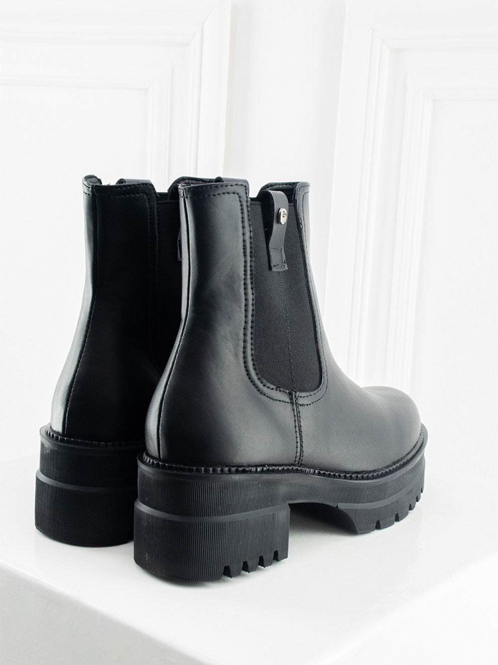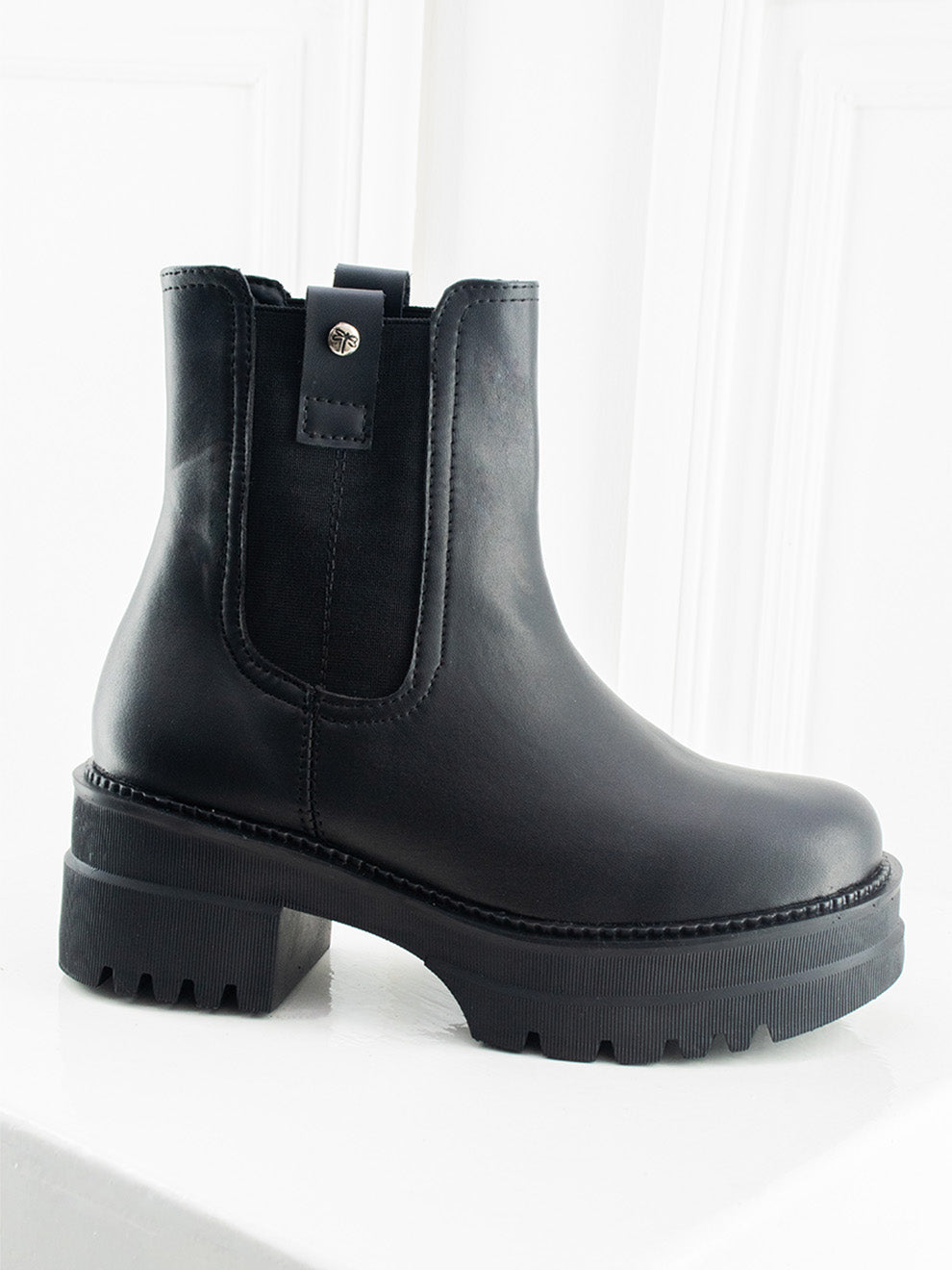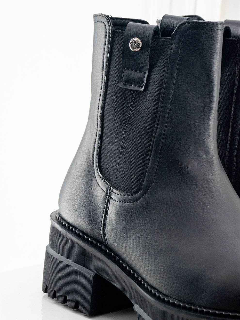 Loreta combina un acabado mate en negro con caña media y resorte lateral para un ajuste cómodo y práctico. Su botón plateado decorativo aporta un toque moderno y sofisticado, mientras la suela gruesa liviana y la horma redonda aseguran comodidad en cada paso. Perfecta para un estilo juvenil, versátil y elegante.