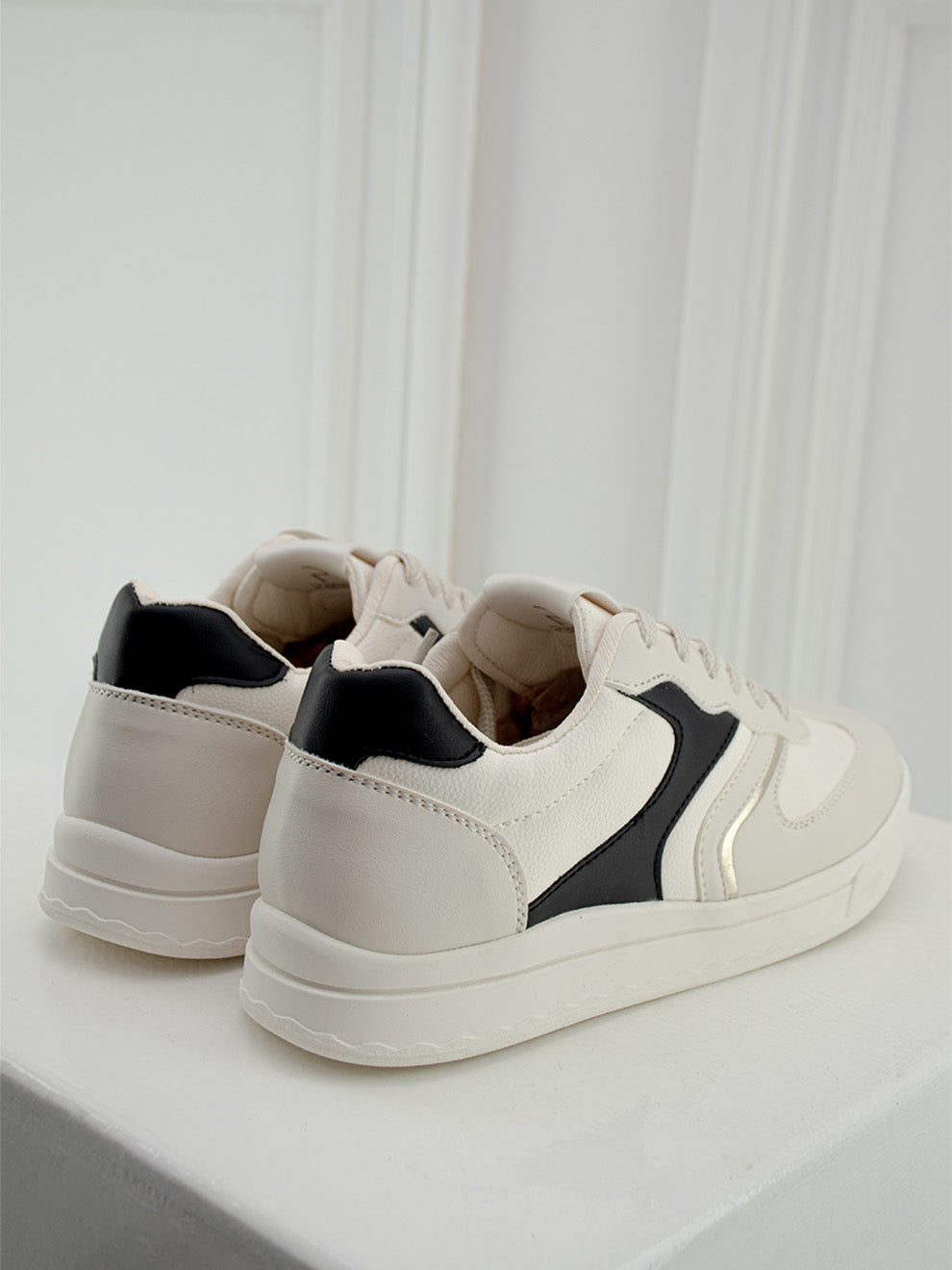 Tenis en textil beige con contraste negro y detalle dorado que eleva el look con un toque sofisticado. Su diseño de amarre, suela liviana y horma redonda brindan comodidad diaria, mientras la plantilla confort y el forro suave aseguran una experiencia de uso ligera y estilosa.