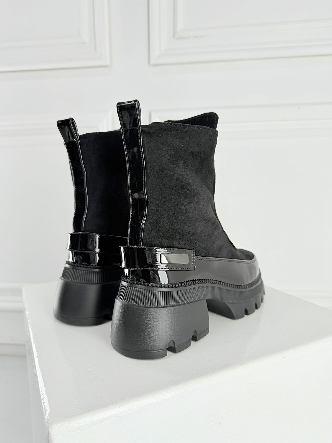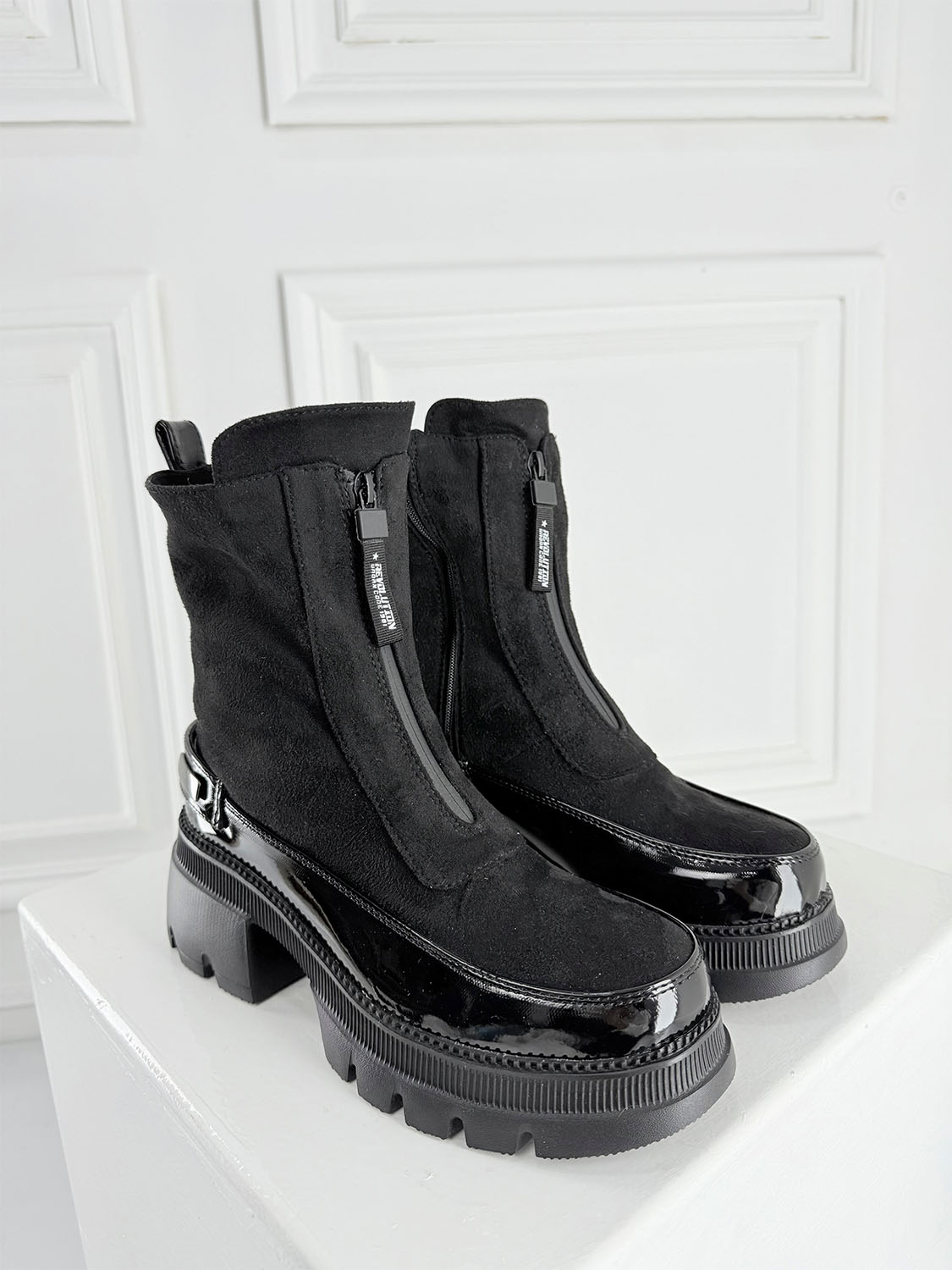 Un diseño que refleja distinción en cada detalle. Su textura tipo reptil en contraste, combinada con la correa cruzada y hebilla metálica, lo convierten en un botín elegante y poderoso.