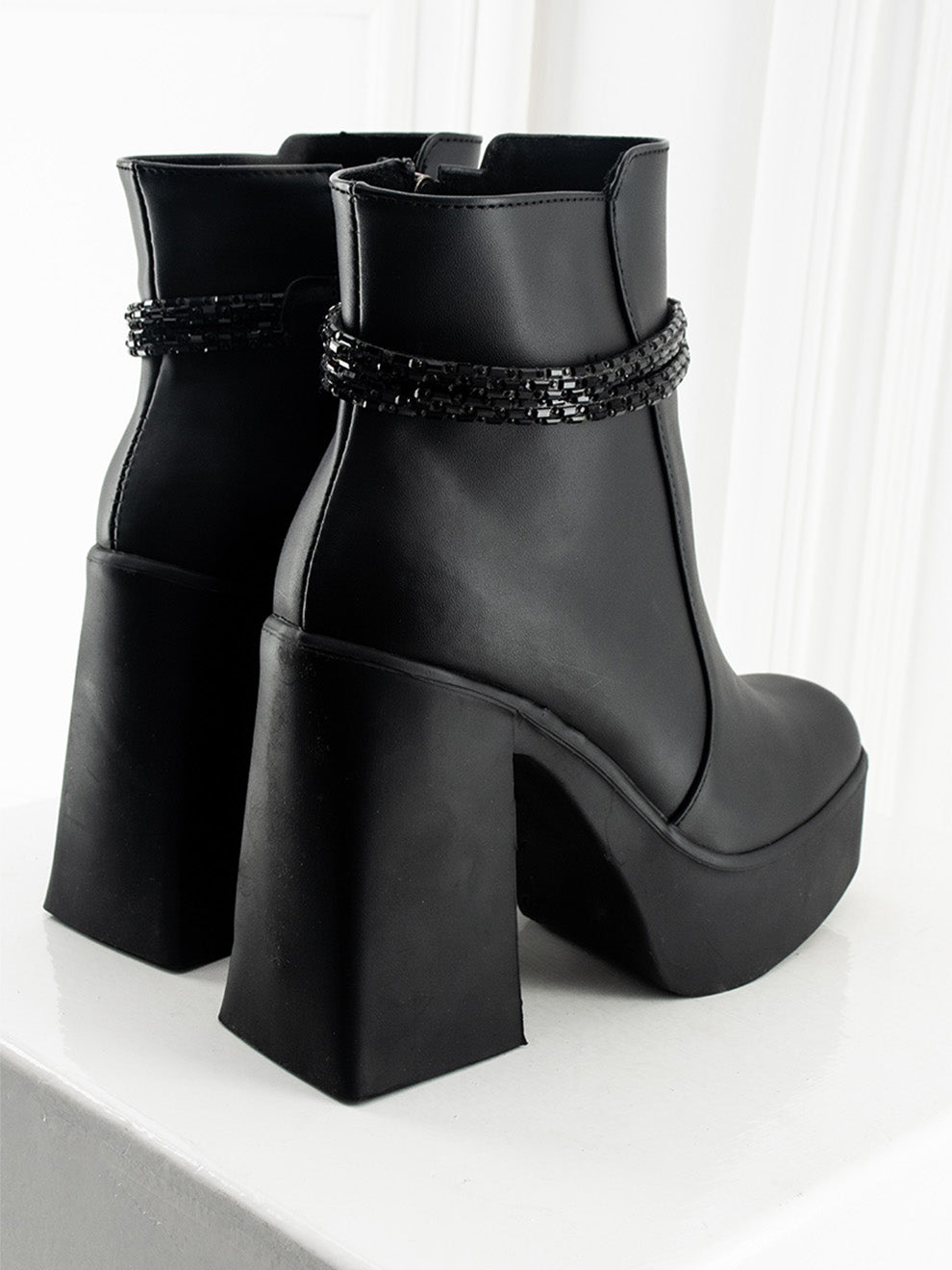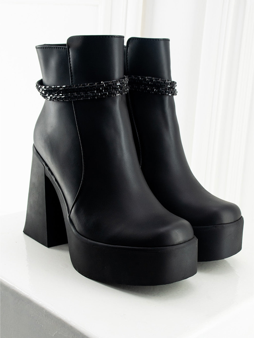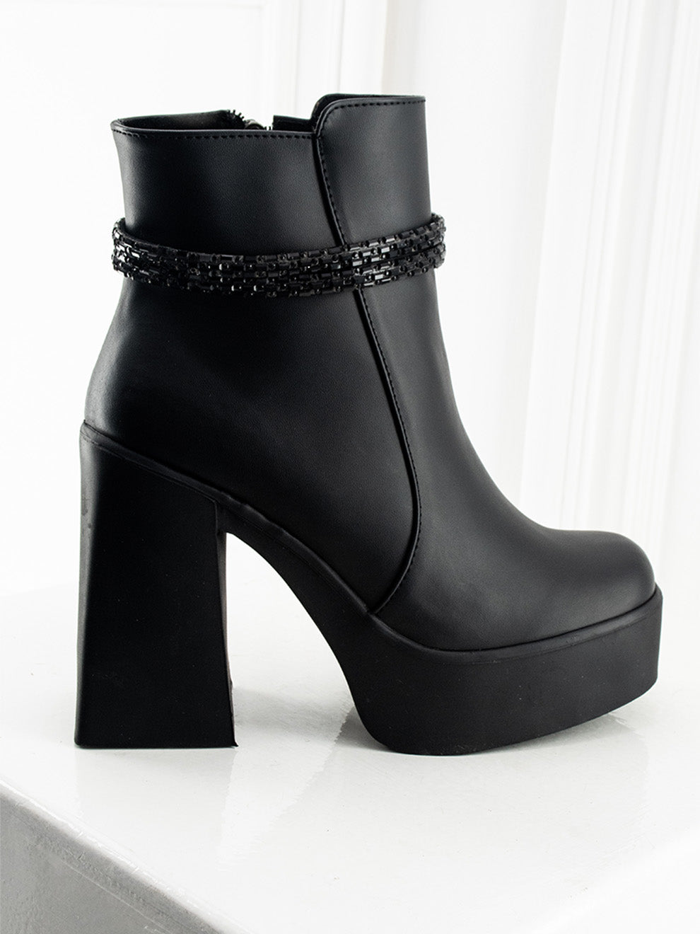Selene combina un acabado mate en tono negro con una correa superior adornada en brillos que aporta un toque moderno y sofisticado. Su tacón con plataforma y horma cuadrada ofrecen altura estable y comodidad, mientras la cremallera interna facilita el calce para un estilo juvenil y distinguido.