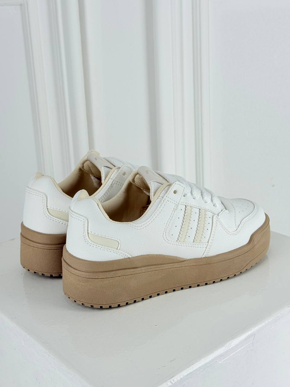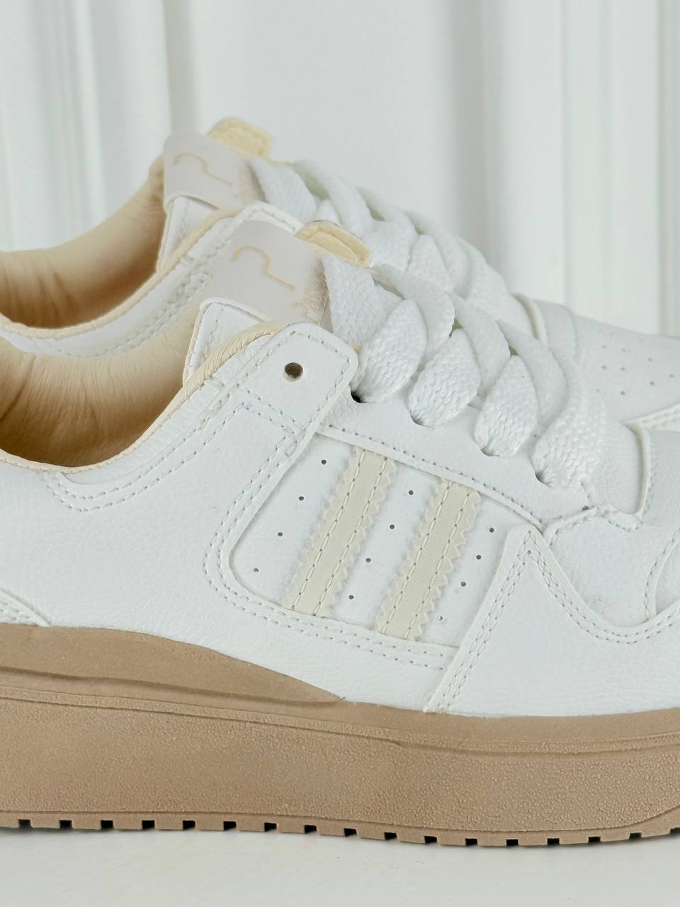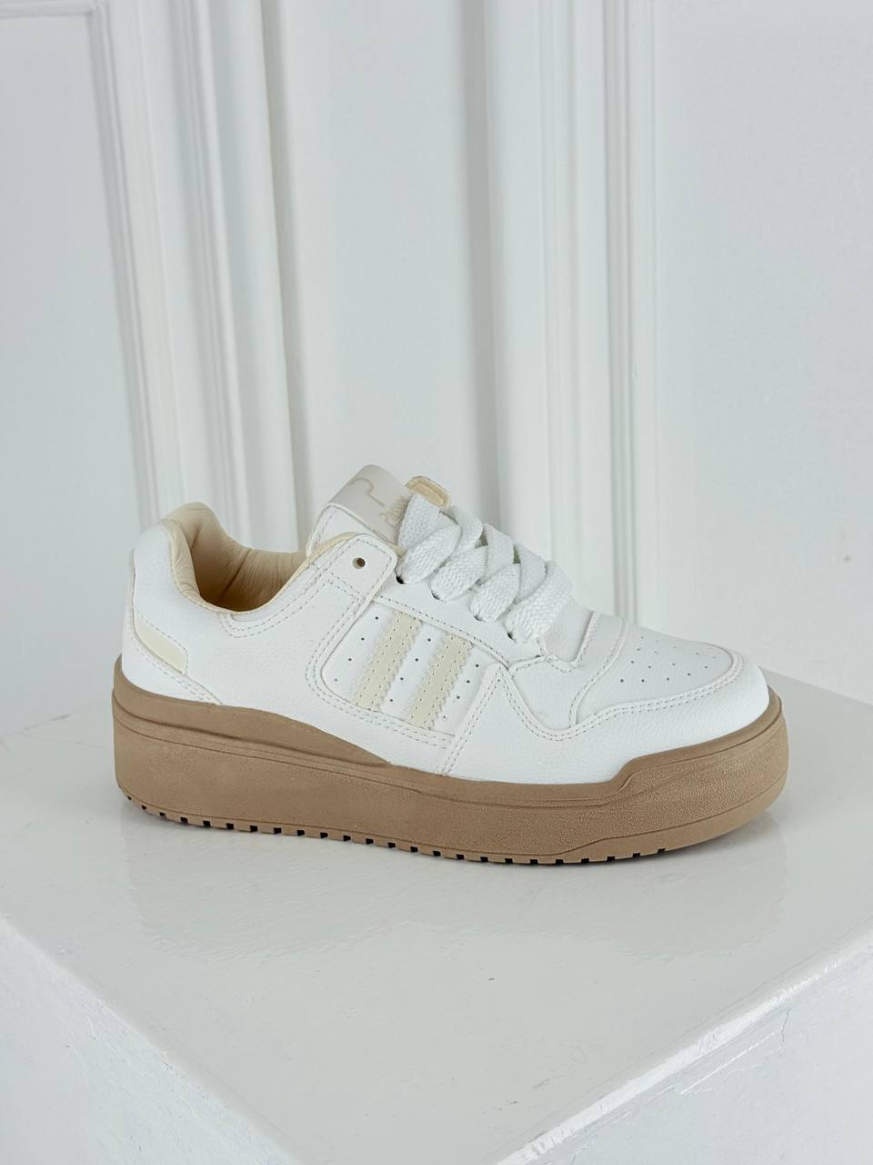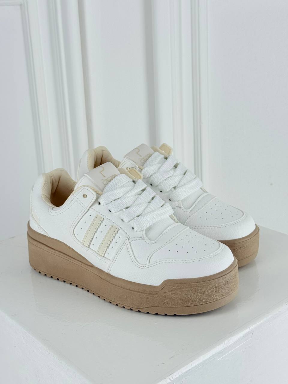 Los tenis Sofía fusionan una estética retro-minimalista con la versatilidad moderna, destacando por su impecable acabado en blanco y detalles en tonos crema que aportan un aire sofisticado. Su diseño se caracteriza por una suela de plataforma en color arena que estiliza la figura, complementada con franjas laterales texturizadas y un interior acolchado que asegura confort absoluto durante todo el día.